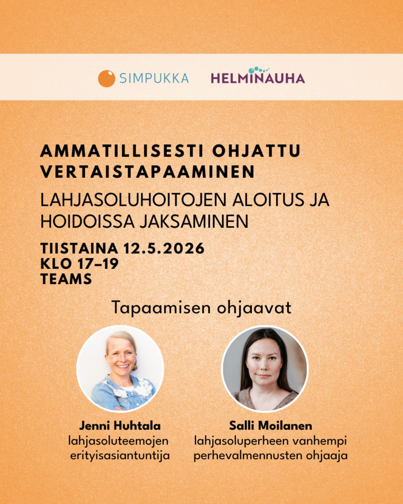 Simpukka ry:n Helminauha-toiminta toteuttaa ammatillisesti ohjatun vertaistapaamisen lahjasoluhoitoja aloittaville ja lahjasoluhoidoissa parhaillaan oleville.