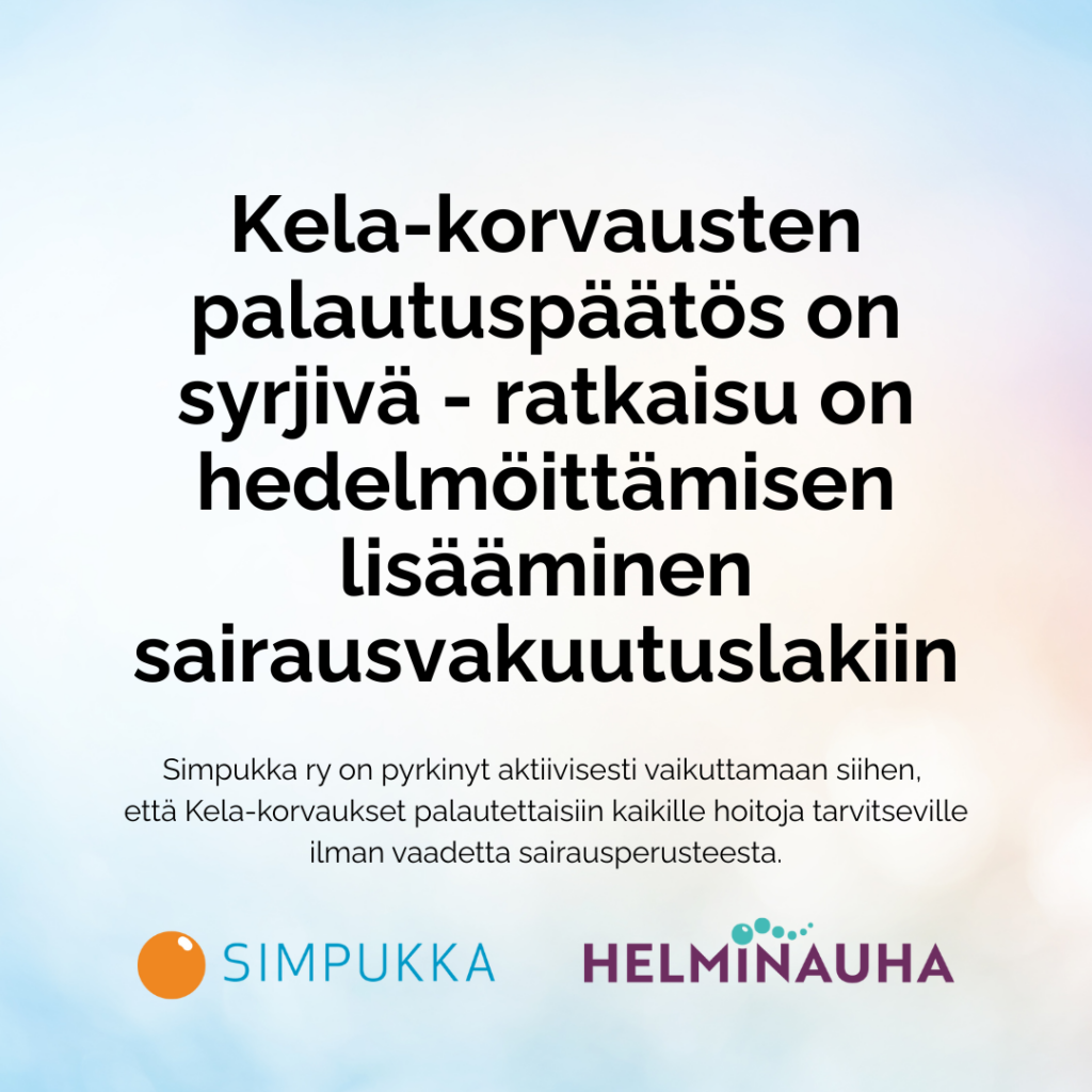 Simpukka ry on pyrkinyt aktiivisesti vaikuttamaan siihen, että Kela-korvaukset palautettaisiin kaikille hoitoja tarvitseville ilman vaadetta sairausperusteesta. Olemme kaksi kertaa lausuneet tähän esitykseen. Ratkaisuehdotuksemme on lisätä sairausvakuutuslakiin hedelmöittäminen yhdeksi korvausperusteeksi raskauden, synnytyksen ja sairauden lisäksi.