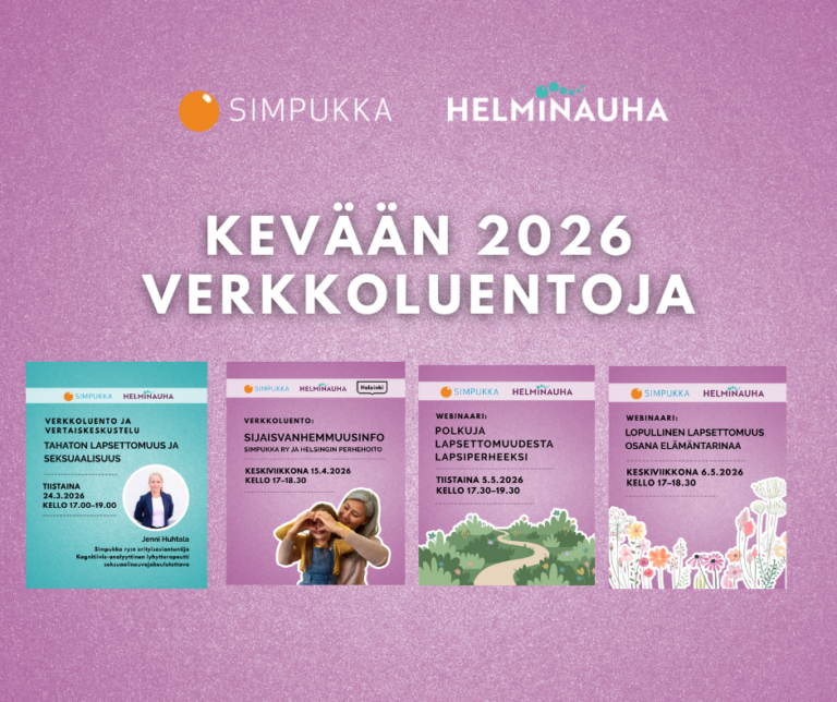 Lisätiedot ja linkki Teamsiin löytyvät Simpukan verkkosivuillta: Webinaari Polkuja lapsettomuudesta lapsiperheeksi