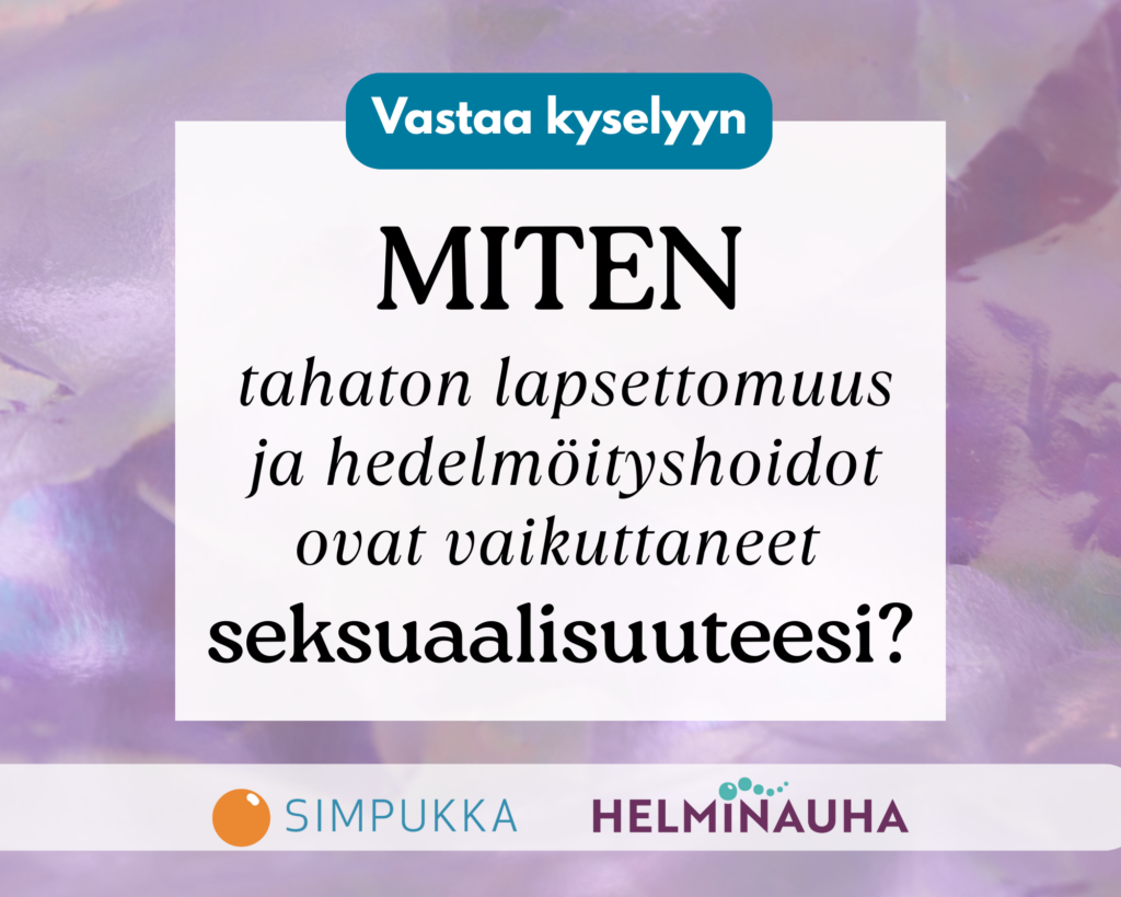 Kysely: Lapsettomuuskokemuksen ja hedelmöityshoitojen vaikutus seksuaalisuuteen sekä vastaajien tiedon ja tuen tarpeet Kyselyn avulla kartoitetaan, millaisia vaikutuksia lapsettomuuskokemuksella ja hedelmöityshoidoilla on seksuaalisuuteen sekä kerätään tietoa vastaajien tiedon ja tuen tarpeista. Kyselyn toteuttajana toimii Lapsettomien yhdistys Simpukka ry. Kyselyyn voivat vastata kaikki sellaiset henkilöt, jotka ovat parhaillaan tai ovat aiemmin olleet omilla tai lahjoitetuilla sukusoluilla toteutetuissa hedelmöityshoidoissa. […]