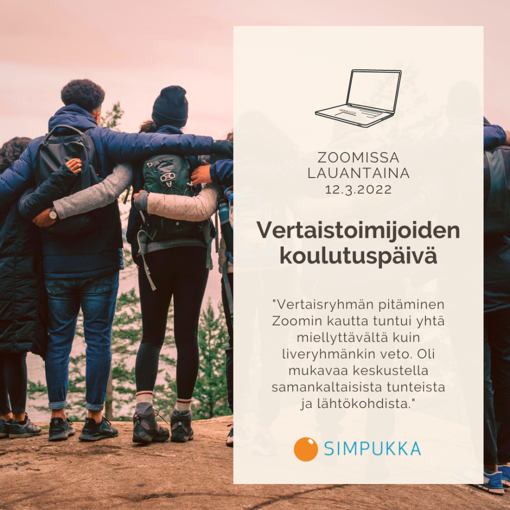 Järjestämme vuotuisen vertaistoimijoiden koulutuspäivän turvallisesti etäkoulutuksena Zoomissa lauantaina 12.3.2022 klo 10-14.45. Olet lämpimästi tervetullut mukaan koulutuspäivään!